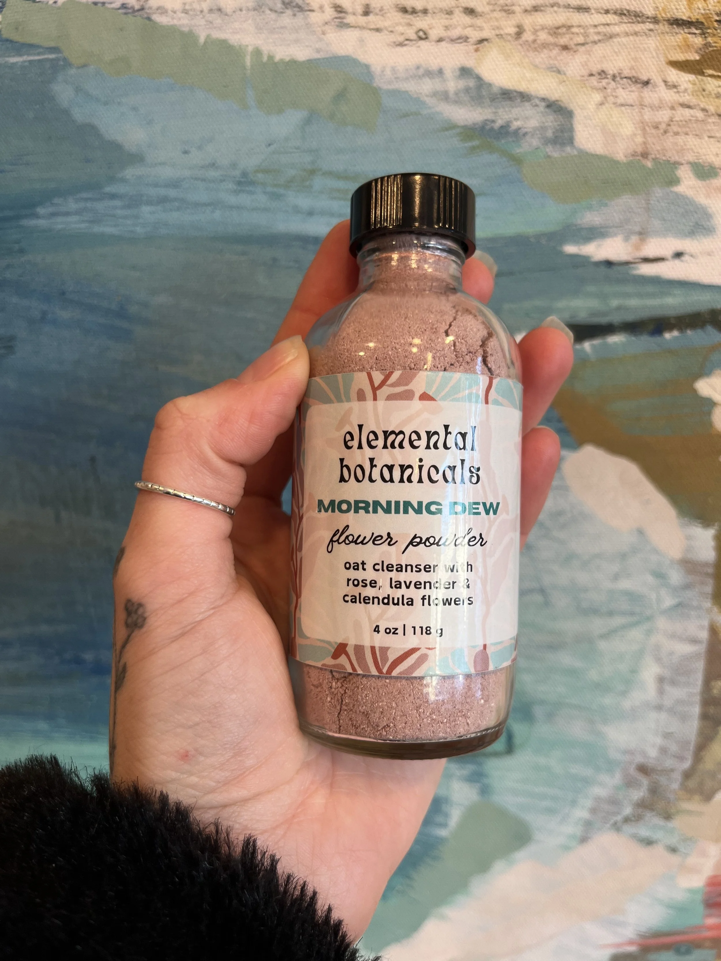 colloidal oats*, almond powder*, kaolin clay, rose petal powder*, calendula flower powder*, lavender flower powder*, copaiba balsam essential oil*, lavender essential oil*, rose essential oil*, jasmine absolute